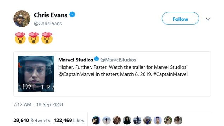 Sau khi phát hành trailer Marvel Marvel sáng nay, một số ngôi sao nổi tiếng và diễn viên điện ảnh đã tiết lộ phản ứng của họ trên mạng, bao gồm ngôi sao hạng A - Chris Evans và nữ diễn viên Tessa Thompson,… Và chắc chắn, điều này sẽ gây sự thú vị cho người hâm mộ siêu anh hùng cũng như khán giả nói chung. Khán giả vẫn đang chờ Captain Marvel ra rạp để xem phim siêu anh hùng nữ đầu tiên của Marvel Studios trên màn ảnh lớn liệu có thành công như bộ phim vào hai năm trước của Warner Bros. - Wonder Woman. Trong khi bộ phim của Patty Jenkins không phải là bộ phim truyện tranh đầu tiên có một nữ siêu anh hùng trong vai chính, nhưng lại là bộ phim đầu tiên được đánh giá cao - và thực tế là nó còn phá vỡ kỷ lục phòng vé của một số bộ phim khác cùng vũ trụ.
