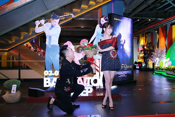 Phở còn nhí nhảnh quỳ xuống tặng hoa cho bạn gái.