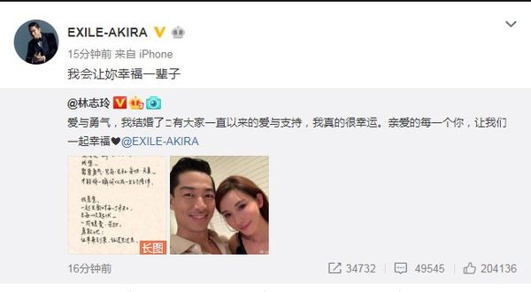 Ngay khi bài viết được đăng tải thì rất nhiều minh tinh cũng đã gởi lời chúc mừng đến Lâm Chí Linh như Thư Kỳ, Mã Thiên Vũ, Trương Hâm Nghệ, Tăng Thuấn Hy, Lý Trị Đình... và đặc biệt là có sự góp mặt của Kiều Hân.