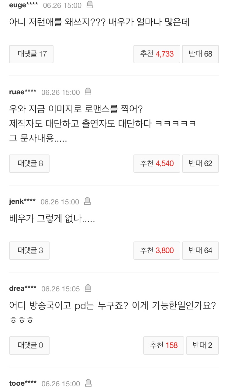 5. [+136, -2] ㅋㅋㅋ Sau tất cả những vụ bê bối với bạn gái cũ, bộ phim trở lại của anh ta là phim lãng mạn ㅋㅋㅋ rồi anh ấy sẽ làm gì, ra tay bạo hành vai nữ chính trong bộ phim hả?