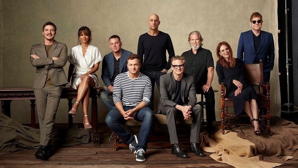 Từ trái sang phải: Pedro Pascal, Halle Berry, Channing Tatum, Taron Egerton, Mark Strong, Colin Firth, Jeff Bridges, Julianne Moore và Elton John trong Kingsman: The Golden Circle.