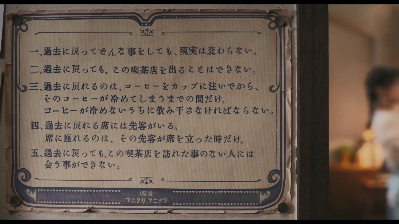 - Thời gian để trở về quá khứ được tính từ lúc cà phê được rót đầy vào tách cho đến khi nguội. Trong lúc cà phê vẫn còn chưa nguội thì phải uống cho bằng hết.