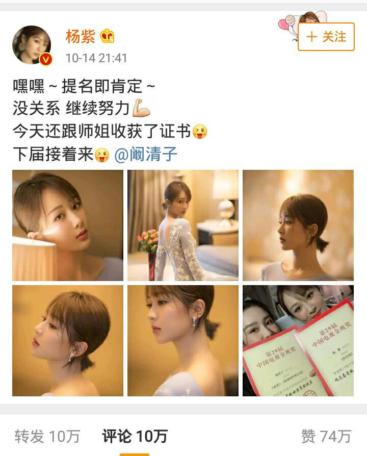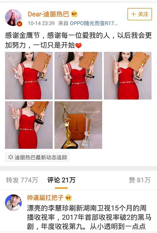 Sau đó, khán giả còn phát hiện rằng với bài viết của Địch Lệ Nhiệt Ba trên weibo cá nhân của mình sau khi nhận được hai giải thưởng: “Cảm ơn Kim Ưng lễ, cảm ơn mỗi một người yêu mến tôi, sau này tôi sẽ càng nổ lực hơn nữa, tất cả chỉ là sự khởi đầu” không hề nhận được bất kỳ lời chúc phúc nào từ khán giả đến đồng nghiệp trong ngành trừ người hâm mộ của cô. Trong khi đó, Dương Tử được xem là bại nhưng không bại, mặc dù ra về tay trắng nhưng lại nhận được trước là sự động viên của khán giả, sau là của bạn bè trong ngành như Hám Thanh Tử: “Em là tuyệt nhất!” hay Lưu Đào tamia: “Tuyệt vời”…
