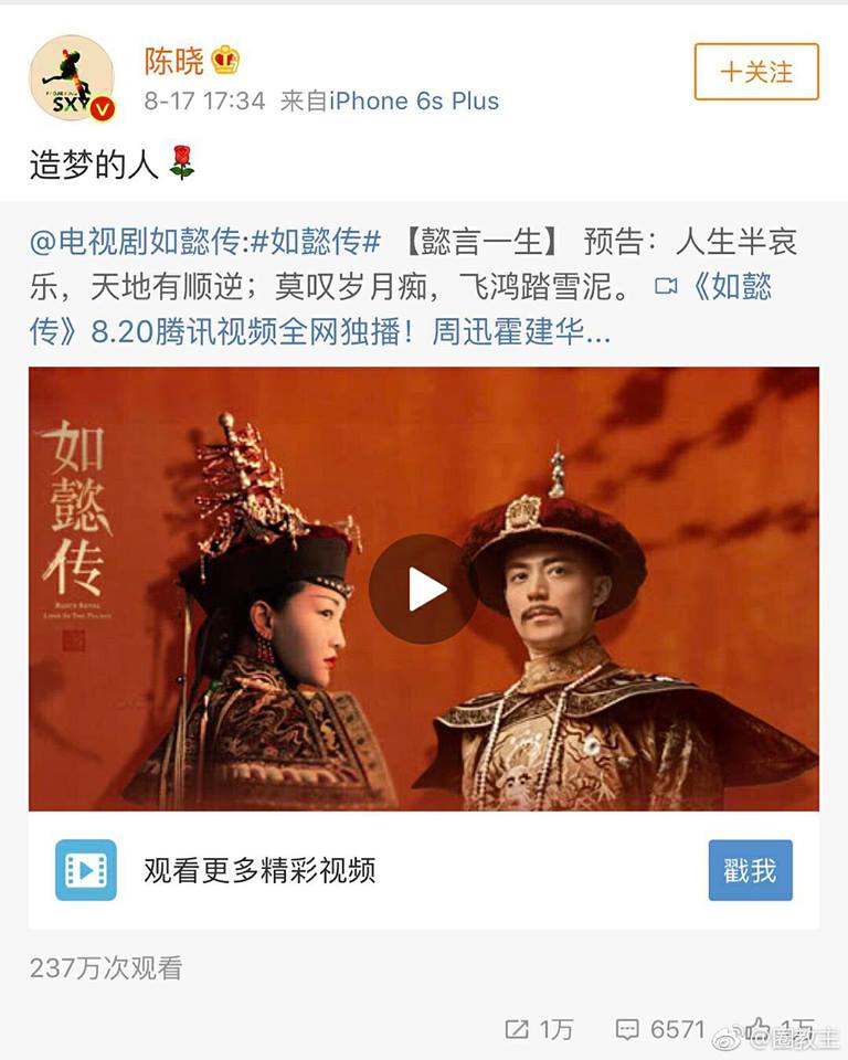 Trần Hiểu shares bài đăng ủng hộ “Như Ý truyện” phát sóng khiến nhiều người bất ngờ.
