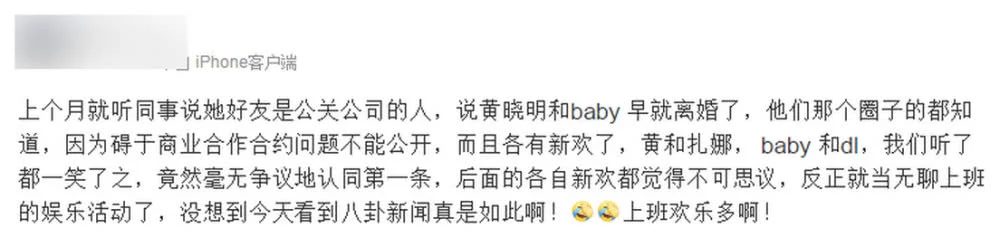 Hôm nay, có cư dân mạng tiết lộ tháng trước nghe đồng nghiệp nói bạn tốt của cô ấy là người của công ty công quan (công ty về truyền thông, quan hệ công chúng PR bao gồm các nhân vật nổi tiếng, doanh nghiệp thương nghiệp, chính phủ…) nói rằng Huỳnh Hiểu Minh và Angelababy đã ly hôn. Người trong giới như họ đều biết, còn tiết lộ thêm rằng bởi vì hợp ước hợp tác thương mại, lợi ích nên không thể công khai. Đồng thời, người này còn tiết lộ mỗi người đều có người mới Huỳnh Hiểu Minh là với Na Trát, Angelababy với nam diễn viên “DL”.