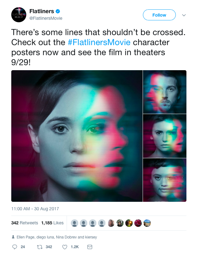 Chỉ còn chưa đầy một tháng nữa, bản reboot của Faltliners (Tựa tiếng Việt: Trải nghiệm điểm chết) của hãng Sony Pictures sẽ ra mắt khán giả kể từ bản gốc đầu tiên vào năm 1990. Nhà sản xuất cũng đã hé lộ poster của cả bốn nhân vật mà thể hiện một mặt hoàn toàn đối lập với các nhân vật chính. Các poster gồm Courtney (Ellen Page), Ray (Diego Luna), Marlo (Nina Dobrev) và cuối cùng Sophia (Kiersey Clemons). Trong khi nhìn thoáng qua thì mỗi nhân vật trên đều có biểu cảm bình thường thế nhưng những poster này thể hiện một mặt khác của họ theo đúng nghĩa đen và rõ ràng là họ đang rất hoảng sợ.