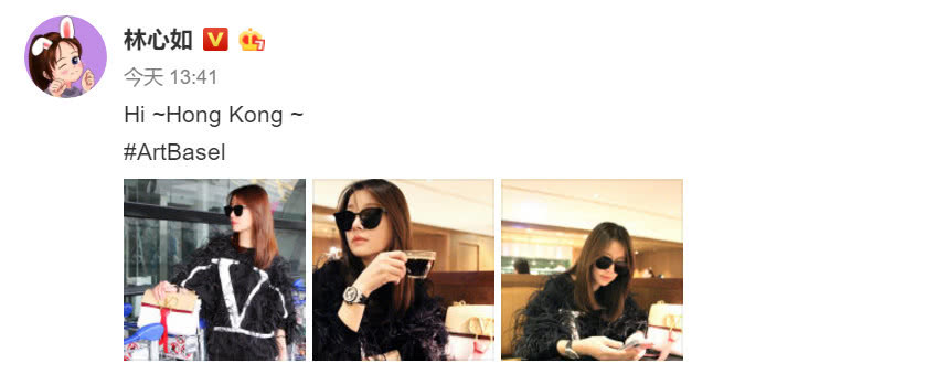Vào ngày 27/03, Lâm Tâm Như cập nhật trạng thái trên Weibo khi đang thưởng thức trà chiều tại Hong Kong. Không biết có phải do vụ thắng kiện vừa rồi hay không mà tâm trạng nữ diễn viên rất tốt và thoải mái. Nàng “Hạ Tử Vy” đeo kính mát cùng chiếc áo màu đen, tạo dáng bên cạnh chiếc túi xách hàng hiệu trông vô cùng độc đoán và cá tính.