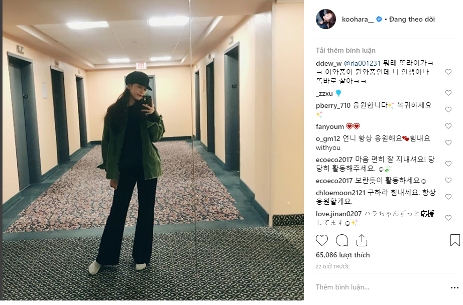 Trong tấm hình, Hara mặc trang phục giản dị và tự chụp trước tấm gương lớn. Mặc dù cô ấy trông có vẻ gầy gò hơn trước, nhưng người hâm mộ vẫn cảm thấy an tâm khi có thể biết được tình hình hiện tại của thần tượng.