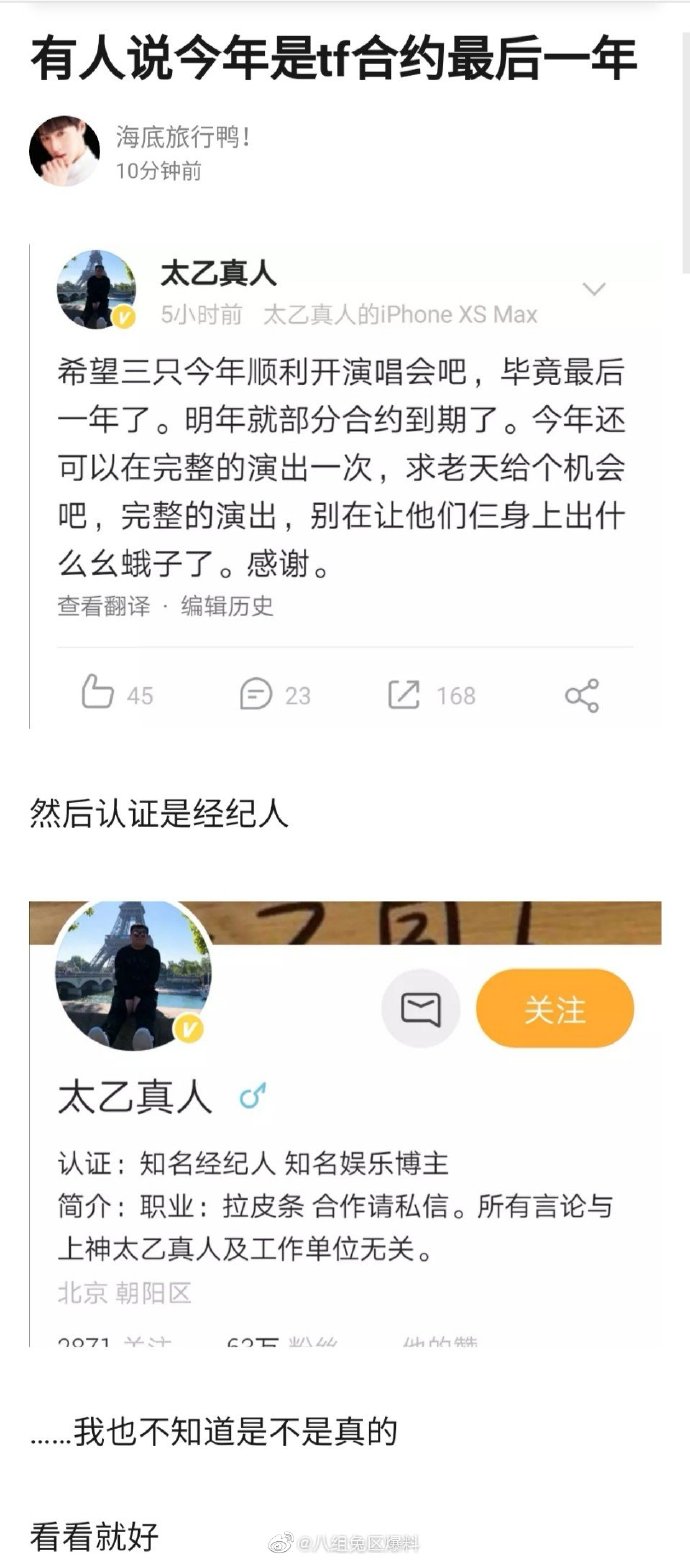 Mới đây, có người quản lý trong ngành giải trí tiết lộ năm nay là năm cuối cùng hợp tác của TFBoys, năm sau đã là đáo hạn hợp đồng. Đến lúc đó, tổ hợp ba thành viên nổi tiếng nhất ở thời điểm hiện tại Vương Tuấn Khải, Vương Nguyên và Dịch Dương Thiên Tỉ sẽ không còn đứng chung trên sân khấu với nhau nữa?