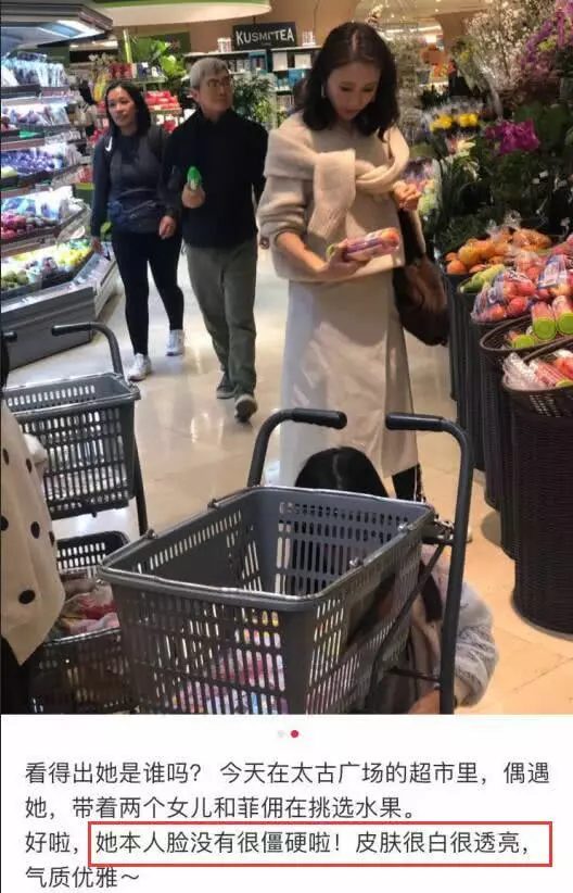 Vào sáng ngày 24/03, dân mạng ngẫu nhiên gặp Lê Tư tại một siêu thị khu quảng trường Thái Cổ ở Hong Kong. Trong bức ảnh này, có thể thấy Lê Tư đang cùng hai cô con gái nhỏ và người giúp việc Philippines chọn lựa hoa quả, mỹ nhân TVB rất ra dáng một “thê lương hiền mẫu”.