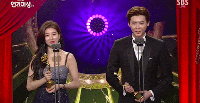 Suzy và Lee Jong Suk đã có một bài phát biểu đáng yêu, cảm ơn nhau vì những màn trình diễn tuyệt vời của họ, thậm chí còn nói đùa với MC Shin Dong Yup về cách họ phát triển tình cảm trong thời gian đóng bộ phim.
