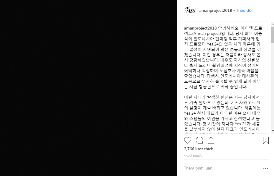 Do công tác xử lý hậu fanmeeting tại Indonesia của công ty trung gian và đơn vị tổ chức Yes 24 tại địa phương gây trì hoãn việc quay trở về nước của diễn viên Lee Jong Suk đã khiến cho nhiều người lo lắng. Lần đầu trải qua trường hợp như vậy nên chúng tôi vô cùng bối rối. Hơn cả việc lo cho bản thân, diễn viên Lee Jong Suk liên tục lo lắng việc này sẽ gây cản trở đến lịch trình quay phim. May mắn thay, với sự giúp đỡ của đại sứ quán Indonesia, cậu ấy hiện tại đang quay trở về nước an toàn.