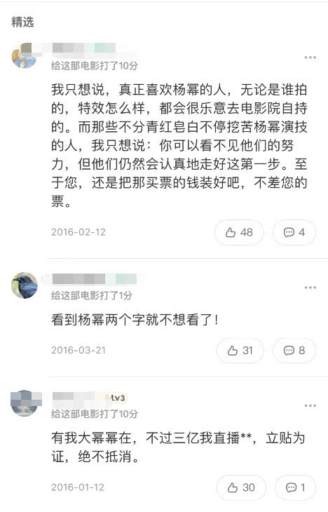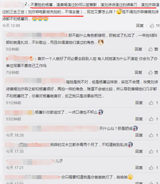 - Dương Mịch đáng ghét, diễn Triệu Mặc Sênh của Đường Yên, diễn Tú Xuân Đao của Lưu Thi Thi, diễn Tam sinh tam thế mà Lưu Diệc Phi đã từng đóng (bản điện ảnh của Lưu Diệc Phi quay trước, không tin thì tra thử), bây giờ lại muốn thế nào nữa? Chả trách mà Lưu Diệc Phi, Đường Yên, Lưu Thi Thi đều không chơi với Dương Mịch nữa.