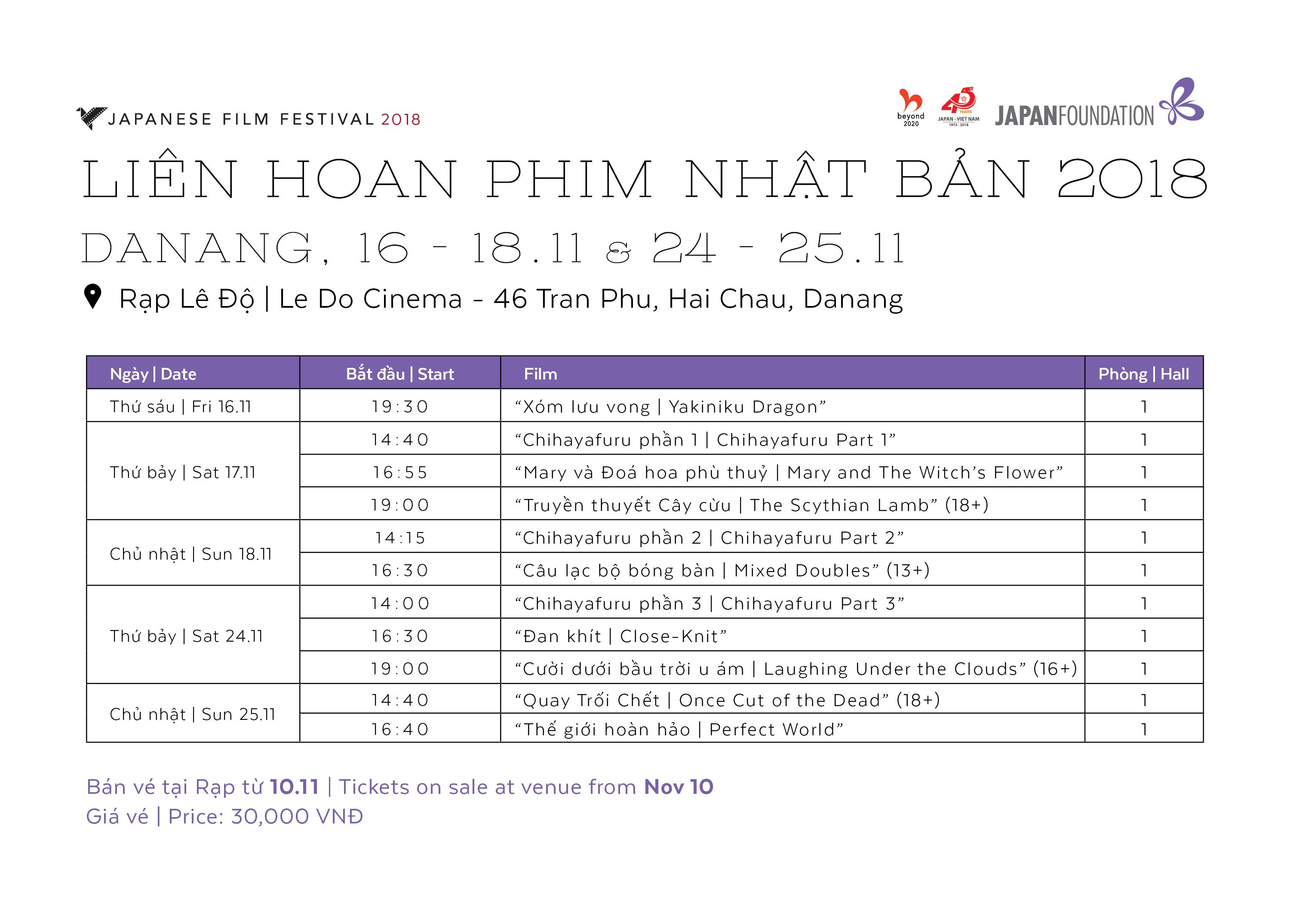 Liên hoan phim Nhật do Trung tâm Giao lưu Văn hoá Nhật Bản tại Việt Nam (The Japan Foundation) tổ chức luôn là sự kiện được mong đợi nhất năm của tất cả khán giả yêu thích và quan tâm đến điện ảnh Nhật Bản. Năm nay địa điểm diễn ra LHP tại Đà Nẵng vẫn là rạp Lê Độ quen thuộc nhưng khác với những năm trước mở cửa tự do phát vé miễn phí, năm nay LHP sẽ thí điểm bán vé đồng giá 30.000 đồng.