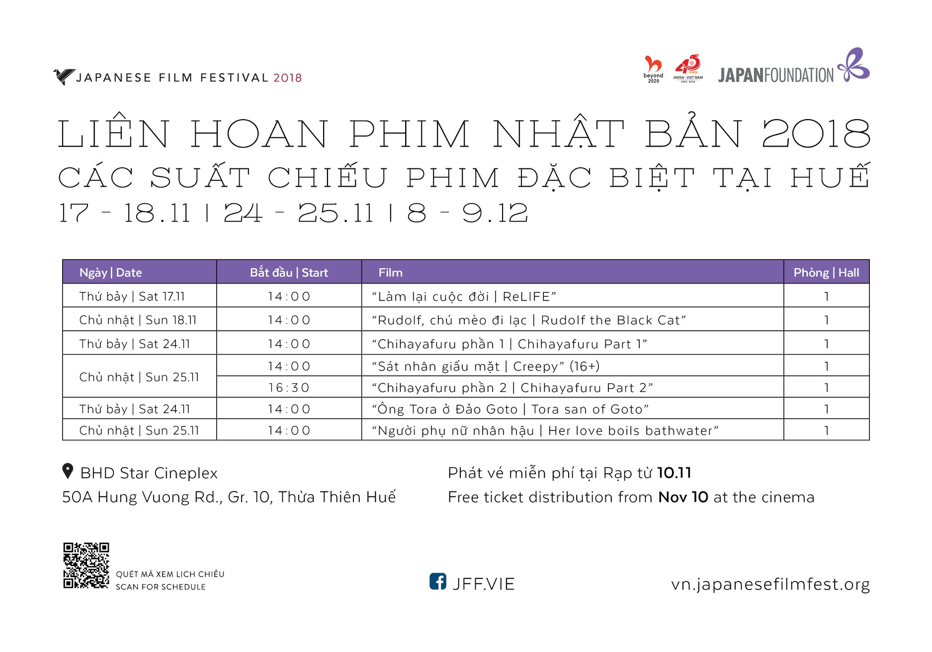 Một điểm mới đáng chú ý nữa là khác với 3 địa điểm Tp.HCM, Đà Nẵng và Hà Nội, LHP tại Huế sẽ có các suất chiếu đặc biệt miễn phí diễn ra từ ngày 17/11/2018 đến ngày 9/12/2018 tại rạp BHD Stars Huế với 7 bộ phim của Nhật Bản được sản xuất từ năm 2016 trở lại đây và là những bộ phim được khán giả yêu thích nhất từ các Liên hoan phim Nhật những năm trước.