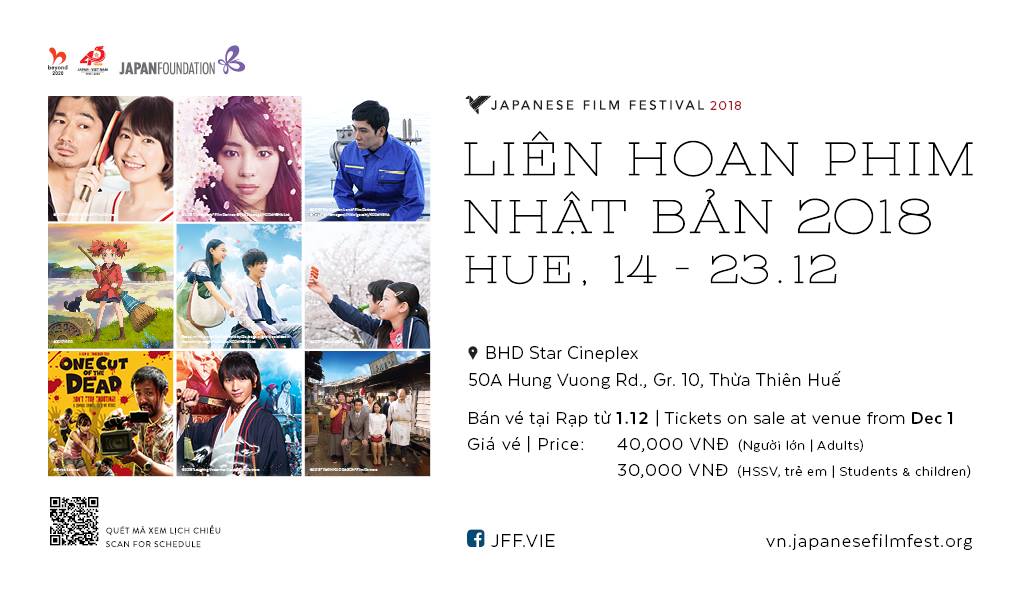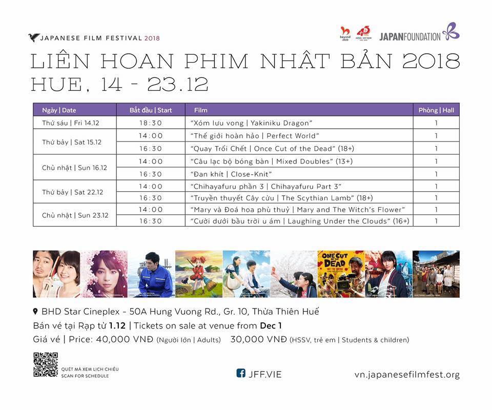 Liên Hoan Phim Nhật lần 2 sẽ diễn ra từ ngày 14/12 đến 23/12/2018 tại tại rạp BHD Stars Huế. Vé đã mở bán tại rạp và trên website của BHD với giá vé đồng hạng mọi ca chiếu mọi vị trí ngồi là 40.000 đồng đối với người lớn và 30.000 đồng đối với trẻ em, học sinh và sinh viên. Tất cả các bộ phim đều được chiếu nguyên bản kèm phụ đề Anh - Việt trừ phim Mary và Đóa hoa phù thủy chỉ có phụ đề Việt. Nếu bạn là tín đồ của điện ảnh Nhật thì nhất định đừng bỏ lỡ sự kiện này nhé.