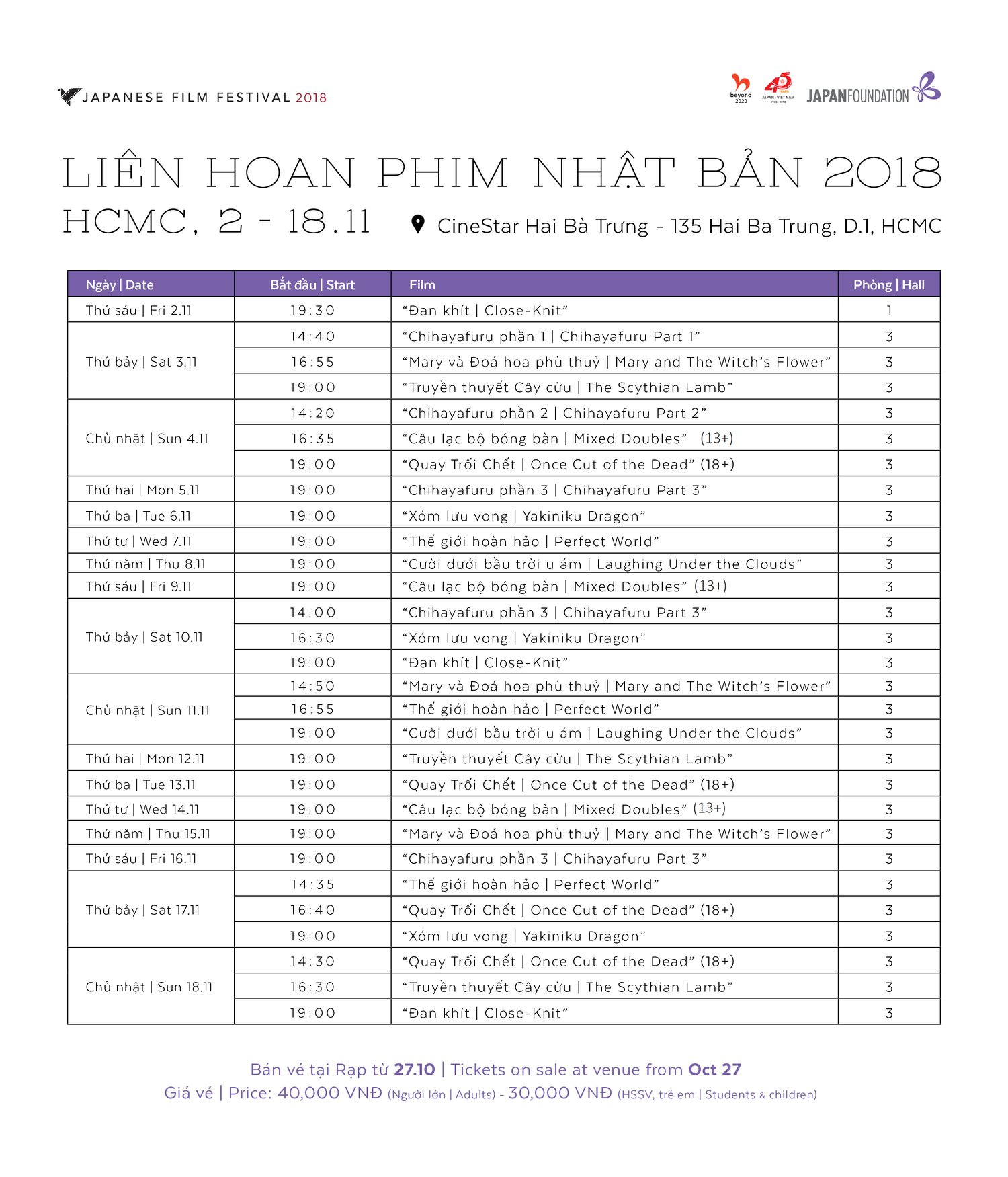 Năm nay thành phố Hồ Chí Minh sẽ là địa điểm được Liên hoan phim ghé thăm đầu tiên với lịch chiếu cụ thể như sau: