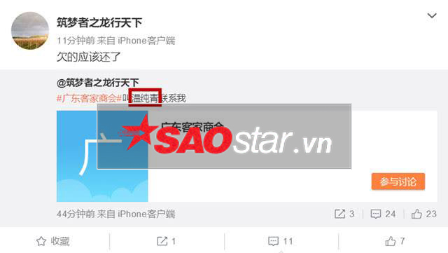 Hôm nay, Huỳnh Hữu Long gây bất ngờ khi đăng Weibo “đòi tiền” con nợ, trực tiếp tag tên đối tượng thiếu tiền, sự việc đã gây nhiều sự chú ý tại Trung Quốc. Chồng Triệu Vy đã gửi đến Hội thương gia Quảng Đông, yêu cầu người có tên Weibo là Ôn Thuần Thanh phải trả số tiền nợ mình. Điều đáng nói Huỳnh Hữu Long đã không sử dụng Weibo hơn 1 năm qua, bất ngờ thay với bài đăng đầu tiên sau quãng thời gian sử dụng mạng xã hội lại là việc “đòi nợ”. Hành động này hiếm khi xảy ra trong giới thượng lưu, chưa kể Huỳnh Hữu Long lại là một tỷ phú của Trung Quốc, là chồng của nữ diễn viên nổi tiếng Triệu Vy. Dân mạng suy đoán tình hình tài chính của “vợ chồng Én nhỏ” đang gặp báo động, dồn vào đường cùng, túng quẫn mới khiến Huỳnh Hữu Long trở nên như vậy.