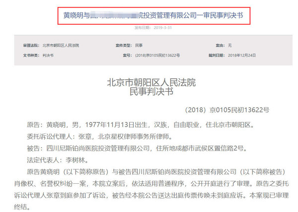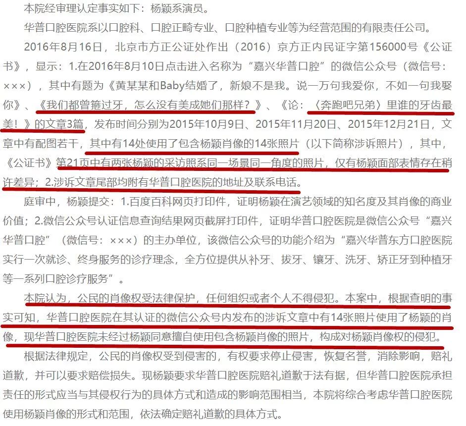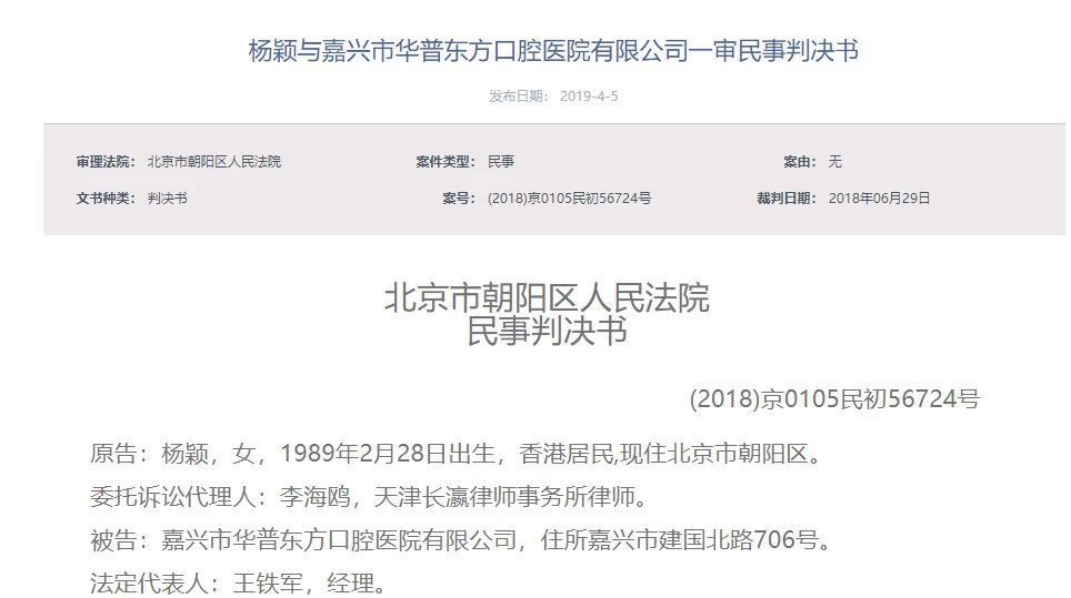 Sáng ngày hôm nay (05/04), thẩm phán Pháp viện Bắc Kinh tuyên bố một trung tâm thẩm mỹ viện đã nhiều lần lấy ảnh Angelababy mà không có sự đồng ý của cô, vụ kiện được nữ diễn viên đề đơn khởi tố vào ngày 29 tháng 6 năm 2018. Tòa án yêu cầu bị cáo phải đăng bài công khai xin lỗi Angelababy trong vòng 7 ngày liên tục và bồi thường thiệt hại về tinh thần lên đến 100 ngàn NDT (tương đương hơn 350 triệu đồng).