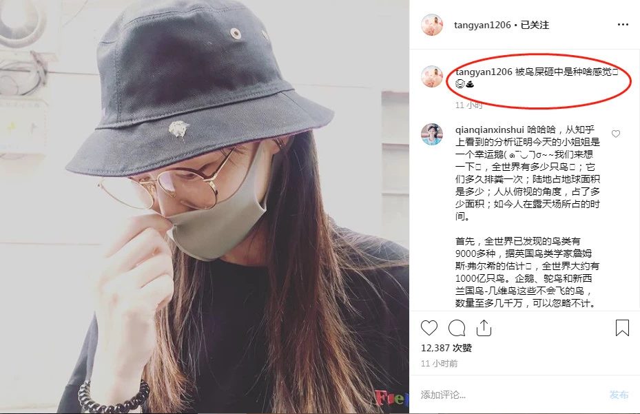 Đêm khuya ngày 16.06, Đường Yên cập nhật trạng thái cùng bức ảnh trên Instagram, bày tỏ bị phân chim rơi trúng mũ thì có cảm giác gì. Trong tấm ảnh, phân chim dính bên trên vành nón của Đường Yên, thật là khiến người ta có chút cảm giác dở khóc dở cười. Dân mạng trêu chọc, lập tức bình luận dưới bài viết: “Ha ha ha ha ha ha, trúng thưởng”, “May mắn là đội mũ, nếu không…”, “Không thể ngăn cản vận may đến với mình”,…