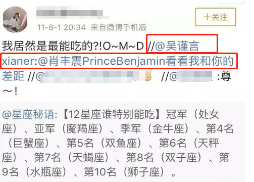 Hầu hết các dòng trạng thái cập nhật trên weibo của Tiêu Phong Chấn đều lưu lại dấu vết bình luận hoặc chia sẻ của Ngô Cẩn Ngôn. Ngô Cẩn Ngôn còn bình luận bằng những stick vô cùng dễ thương ngọt ngào, có thể thấy hai người có quan hệ không hề bình thường.
