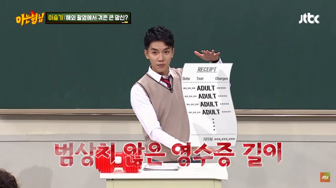 Nam ca sĩ tiếp tục: “Em đã ở đó trong 2 ngày 3 đêm, và khi trả phòng, thì quầy lễ tân bị phân ra. Người quản lý đã gọi em đến và hỏi: 'Cậu đã xem bao nhiêu hả, Seung Gi? Trên hóa đơn này đã đạt tới gần 200 đô la'. Lúc đó em phát hiện ra rằng bất cứ khi nào em chuyển kênh, nó sẽ được tính thêm vào phí phòng”.