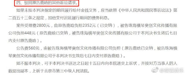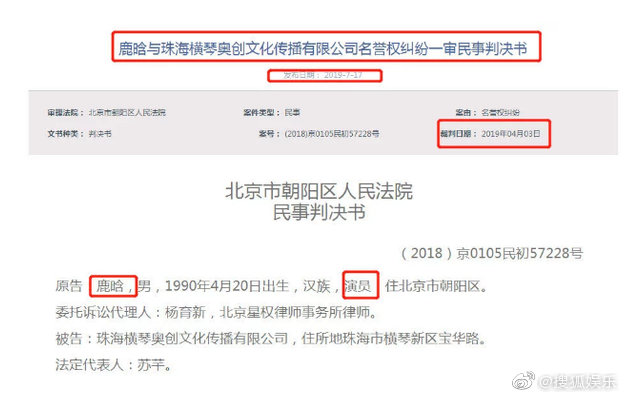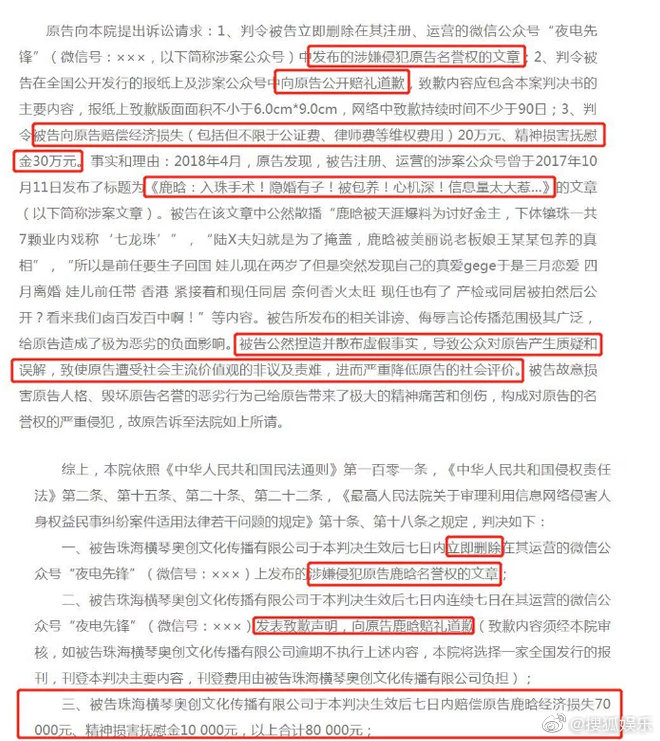 Cuối cùng, tòa án thông qua bản án xét xử và yêu cầu bị áo phải xóa bài viết xâm phạm quyền lợi, đồng thời phải công khai lên tiếng xin lỗi Lộc Hàm. Bên cạnh đó, công ty truyền thông này phải bồi thường tổn thất về kinh tế là 70,000 NDT và tiền tổn thất về mặt tinh thần là 10,000 NDT.