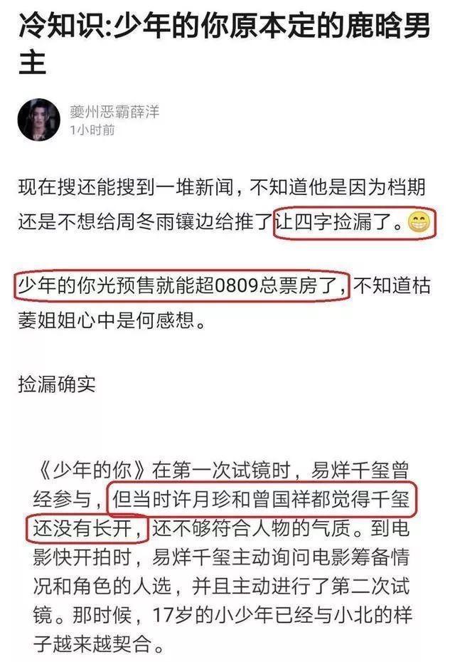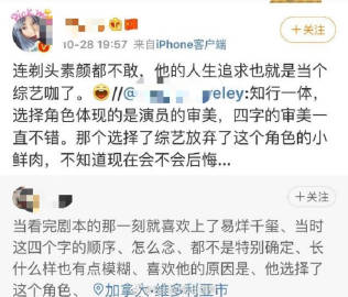 Hôm nay, có một tài khoản V khen Dịch Dương Thiên Tỉ và chỉ trích một tiểu thịt tươi vào thời điểm đó chọn chương trình giải trí mà từ bỏ phim này, đến cả đầu đinh cũng không dám cắt không biết bây giờ có hối hận không.