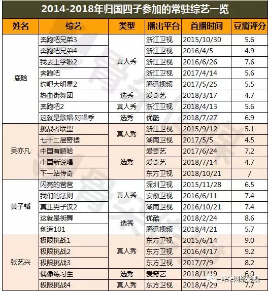 Nếu so với khả năng diễn xuất, thanh nhạc hay vũ đạo thì mất nhiều thời gian để rèn luyện, trau dồi. Còn chương trình giải trí thì thời gian chuẩn bị ngắn, lại thu về nhiều fan, tính đề tài cao. Vì thế đây là lựa chọn đầu tiên khi 4 người quay về nước phát triển. Cả 4 người đều là lưu lượng tiểu sinh tuyến 1, cho nên chương trình nào muốn hot thì hãy mời họ. Khi các show thực tế thịnh hành cả 4 người đều tham gia, khi các chương trình thực tế trở nên thoái trào, 4 người chuyển sang làm cố vấn cho các chương trình lựa chọn tài năng trẻ.