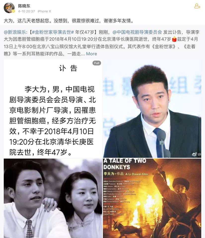 Trần Hiểu Đông đã share lại bài viết của Sina về sự ra đi của cố đạo diễn Lí Đại Vi và nói rằng: “Đại Vi, mấy ngày nay tôi nhớ đến anh. Thật không ngờ, nó lại chấn kinh và buồn đến vậy. Cảm ơn những năm tình cảm giữa chúng ta”.
