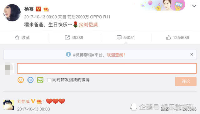 Vào chiều ngày 20 tháng 10, Cổ Cự Cơ đăng tải những bức hình trong tiệc sinh nhật của Cổ Thiên Lạc, trong đó có sự xuất hiện của Lưu Khải Uy. Điều đáng chú ý ở đây cả hai tay của Lưu Khải Uy đều không hề mang nhẫn cưới. Phim nghệ thuật Bảo bối nhi của Dương Mịch ra rạp, nam diễn viên cũng chẳng hề đăng bài trên Weibo cổ vũ hay động viên vợ. Với hai động thái này, liệu tin đồn cặp đôi ly hôn đã trở thành sự thật?