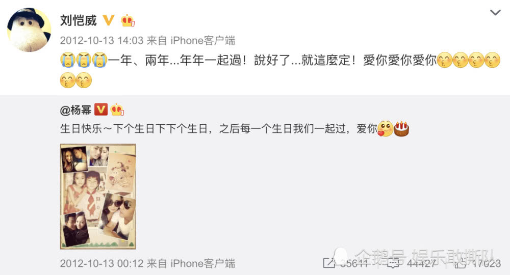 Lưu Khải Uy và Dương Mịch công khai mối quan hệ vào ngày 8 tháng 1 năm 2012. Từ đó cho đến nay, cứ vào 0h ngày 13 tháng 10 hằng năm, Dương Mịch đều gửi tặng lời chúc đến “đức lang quân”, sau đó Lưu Khải Uy luôn đáp trả bằng những lời ngọt ngào nhất. Vào dịp sinh nhật đầu tiên của Lưu Khải Uy sau khi cặp đôi công khai tình cảm, Dương Mịch đã gửi lời chúc như một lời ước hẹn mãi mãi hạnh phúc về sau: “Chúc mừng sinh nhật, sinh nhật sau, sau nữa, sau mỗi sinh nhật chúng ta đều cùng nhau trải qua, yêu anh“.