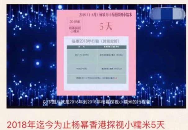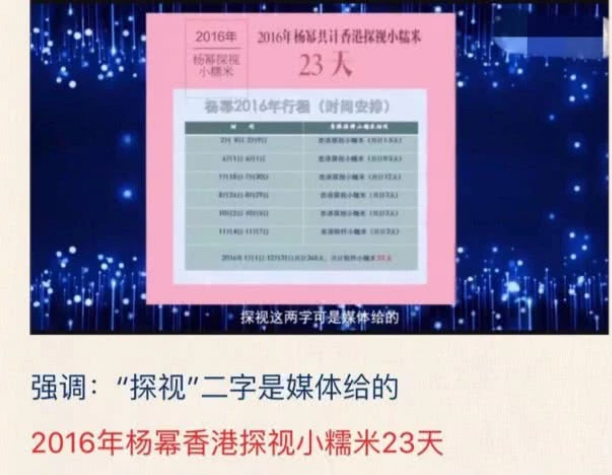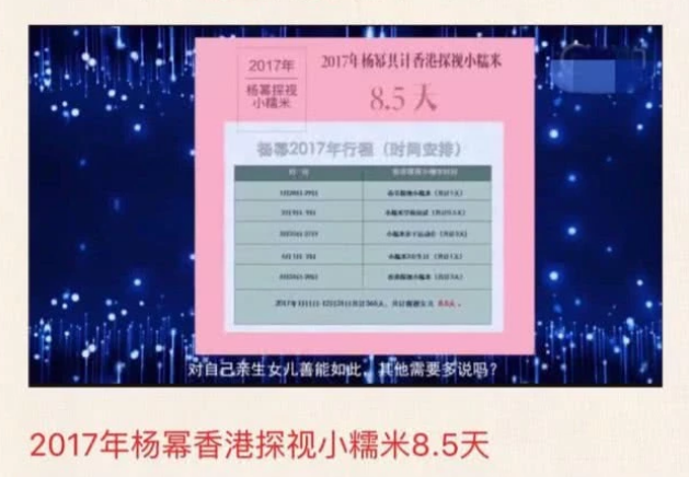 Từng có dân mạng thống kê số ngày thăm con trong vòng 1 năm của Dương Mịch, và dần dần số ngày lại càng trở nên ít đi. Chẳng hạn, năm 2016, Dương Mịch đến Hong Kong ở bên Tiểu Gạo Nếp trong 23 ngày. Nếu nhìn vào lịch trình công việc của nữ diễn viên, nửa tháng đến một lần đã là điều khó khăn và cố gắng hết sức của cô, nên số ngày như thế được xem là hợp lý. Nhưng năm 2017 chỉ còn 8 ngày rưỡi, và năm 2018 (từ tháng 1 - tháng 8) là 5 ngày. Năm 2019 đã trôi qua được 8 tháng và cô chỉ mới đến Hong Kong đúng 2 lần.