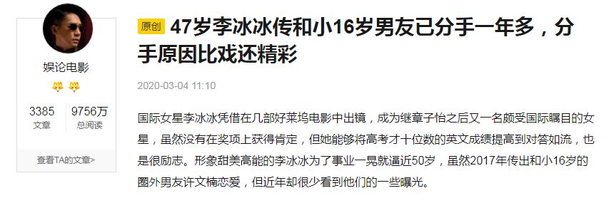 Thông tin bài viết tiết lộ lý do chia tay giữa Lý Băng Băng và người tình trẻ tuổi trên Sohu.