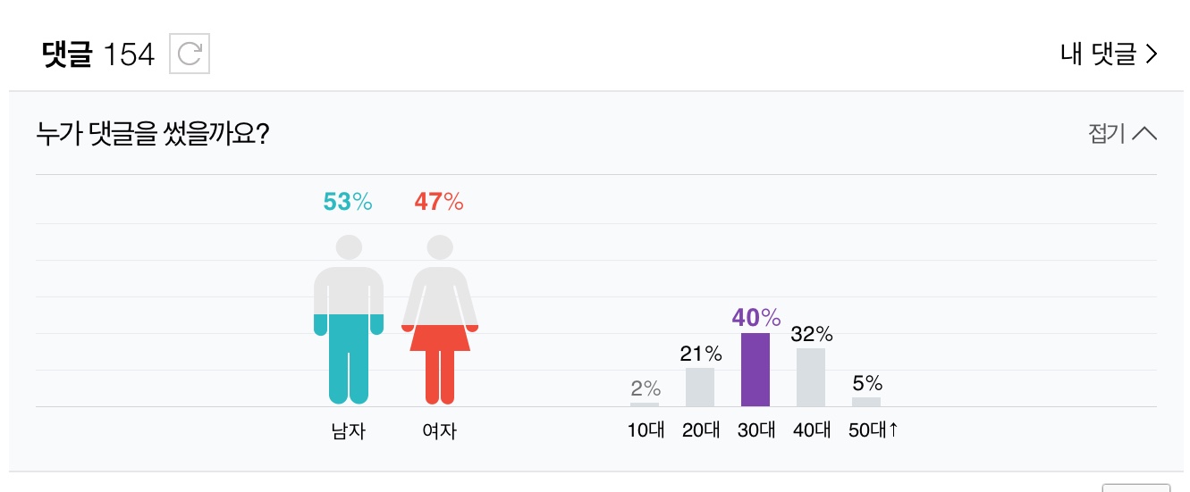 Chiếm 40% người bình luận ở độ tuổi 30, 32% ở độ tuổi 40, 21% ở độ tuổi 20. 5% độ tuổi 50 trở lên và 2% ở độ tuổi 10. Trong đó, nam giới chiếm 53%, nữ giới chiếm 47%.