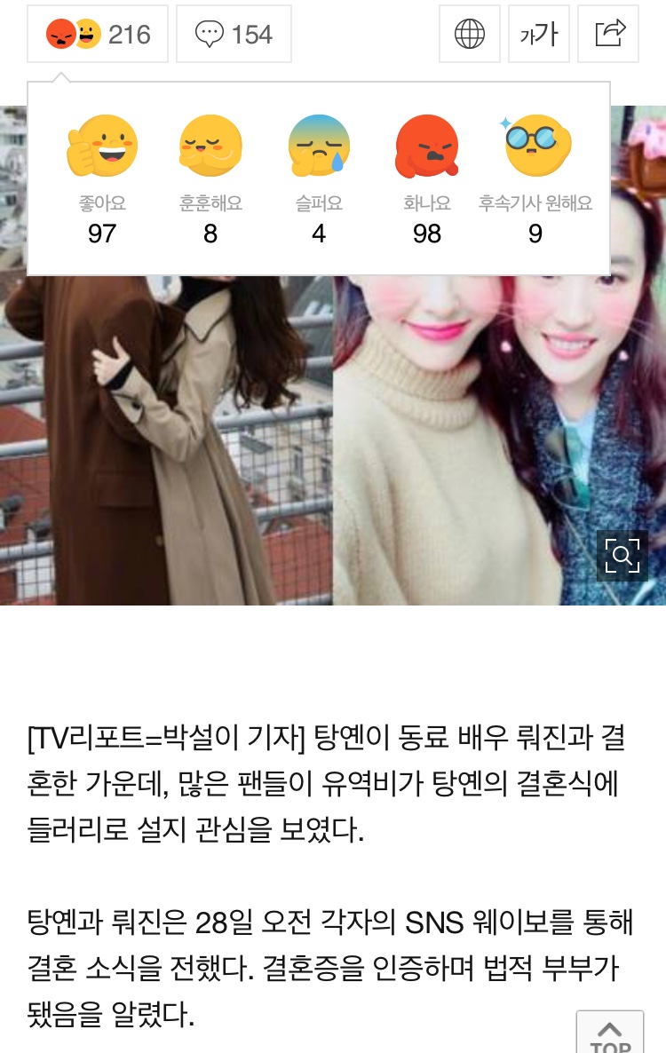 Ngày 28/10 vừa qua, phương tiện truyền thông cũng như hàng chục tờ báo lớn nhỏ Hàn Quốc cập nhật những báo cáo liên quan đến hôn lễ của hai ngôi sao Trung Quốc - Đường Yên và La Tấn. Từ bộ ảnh cưới, địa điểm tổ chức, quy tắc tham dự cho đến dàn khách mời và thậm chí thông tin đồng nghiệp bận bịu công việc đành phải chúc mừng cặp đôi qua mạng xã hội Weibo. Tuy nhiên, do những bài báo phủ sóng trên các cổng thông tin và đặc biệt trên trang web chính thống nổi tiếng Naver với số lượng xuất bản “khủng khiếp”, nên đã khiến cư dân mạng địa phương bày tỏ sự giận dữ và khó chịu.
