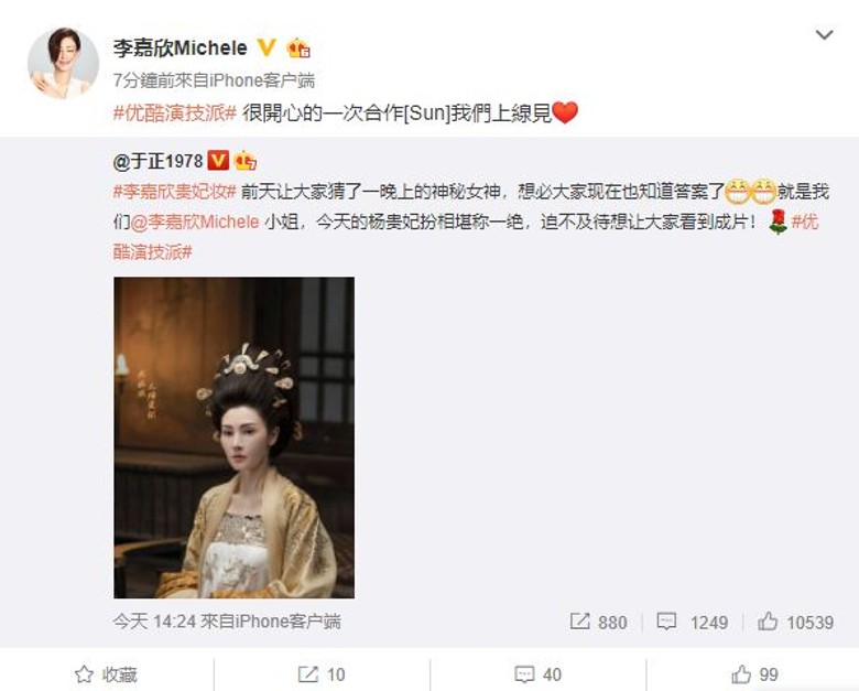 Sau đó không lâu Vu Chính còn đăng tải thêm hình ảnh cổ trang của Lý Gia Hân, ông để lại lời nhắn: “Hình ảnh của Quý phi Lý Gia Hân. Trước đó mọi người đều đang đoán nữ thần thần bí, tin chắc hiện tại mọi người đã biết được đáp án. Đó chính là Lý Gia Hân của chúng ta, hôm nay với hình ảnh Dương Quý phi tuyệt sắc, tin chắc mọi người đều đang mong thành phim.” Sau đó Lý Gia Hân đã chia sẻ bài viết, đồng thời còn viết: “Lần hợp tác này rất vui, chúng ta lên sóng gặp”.