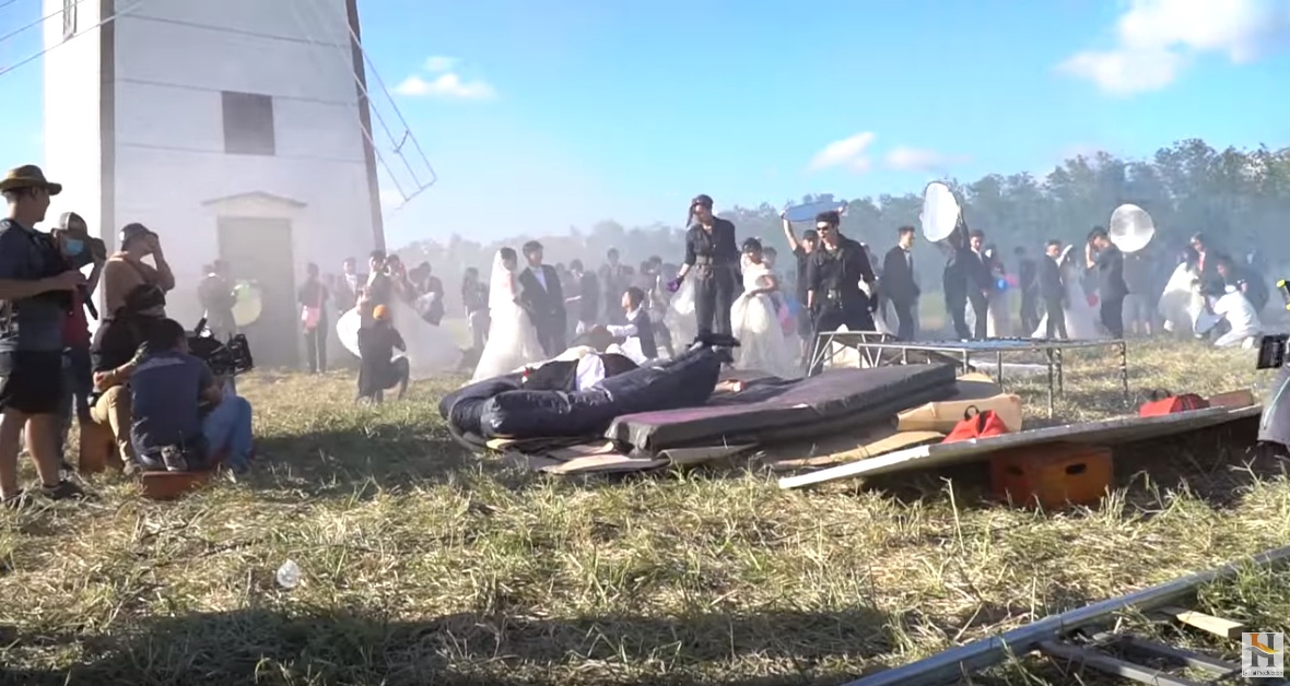 Vây quanh chiếc cối xay là 400 diễn viên quần chúng được tuyển chọn kỹ càng về mặt ngoại hình, thêm vào đó là hàng trăm nhân viên hậu trường, nâng tổng số nhân lực trên trường quay lên tới con số cả ngàn người. 400 nhân vật cô dâu chú rể tương ứng với 400 bộ váy cưới và vest cưới được chuẩn bị chỉn chu. Để cảnh quay diễn ra đúng theo ý tưởng của đạo diễn Lý Hải, 400 diễn viên được chia thành nhiều nhóm nhỏ với sự quản lý, hướng dẫn của đội ngũ nhân viên chuyên nghiệp.