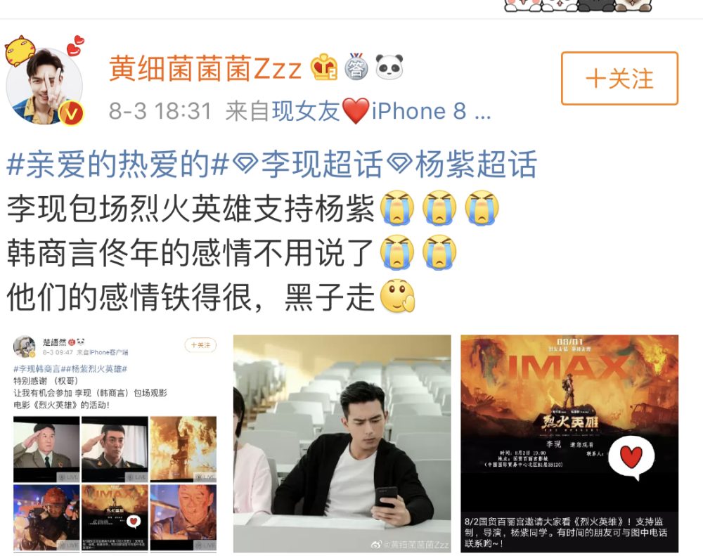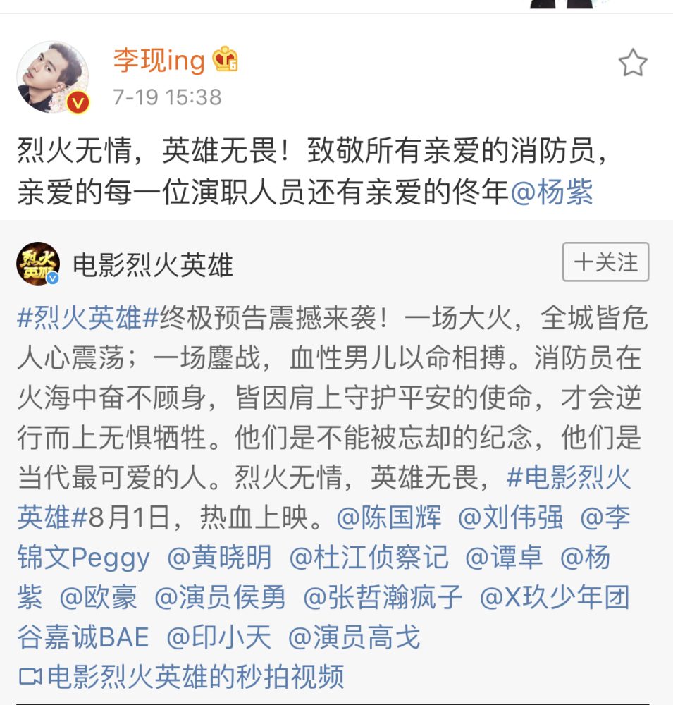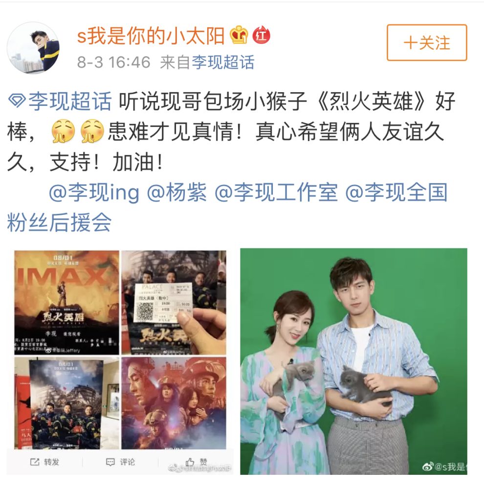 Nhân viên Nhất Tâm giải trí cũng viết rất rõ, Lý Hiện bao cả rạp phim là vì Dương Tử. Phim truyền hình Thân ái, nhiệt tình yêu thương do hai người đảm nhận vai chính mang về thành tích rất tốt, càng củng cố thêm tình bạn giữa họ. Vào tháng 7, Lý Hiện từng đăng lên weibo tuyên truyền cho phim Liệt hỏa anh hùng, lúc đó anh còn hứa với Dương Tử sẽ bao cả rạp phim.