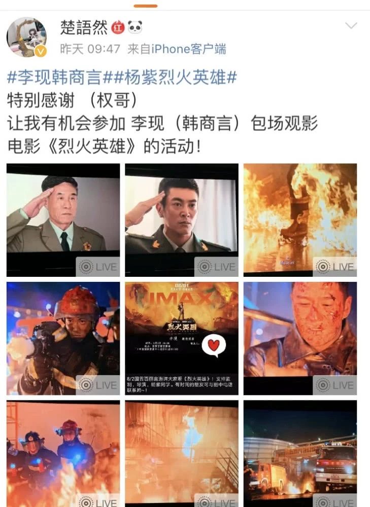 Ngày 3 tháng 8, đột nhiên có cư dân mạng phát hiện Lý Hiện đã bao cả rạp phim chiếu tác phẩm điện ảnh mới có sự tham gia của Dương Tử - Liệt hỏa anh hùng. Đồng thời, anh cũng thông qua công ty quản lý Nhất Tâm giải trí mời những nhân viên đến xem bộ phim này. Những người may mắn được mời, sau khi xem xong bộ phim điện ảnh này đã công khai gởi lời cảm ơn đến Lý hiện và Nhất Tâm giải trí trên weibo.