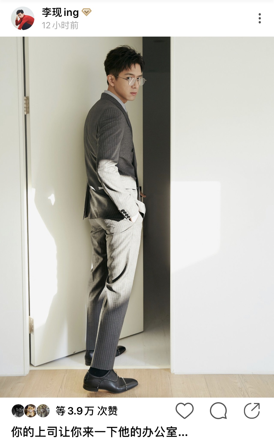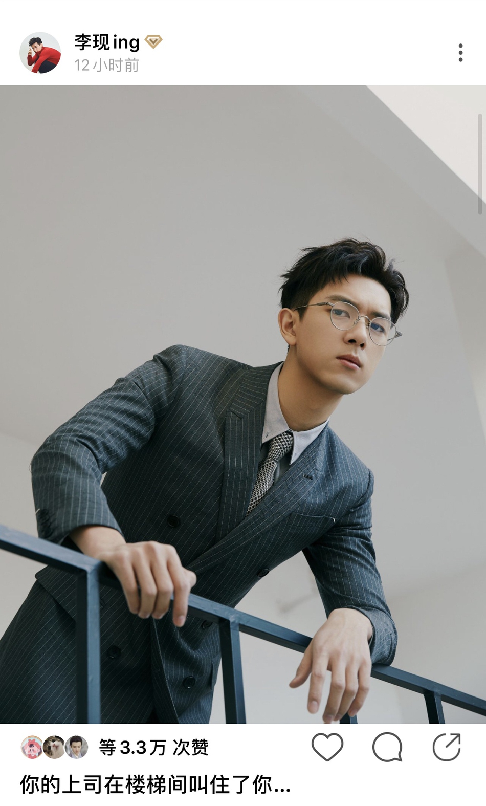 Để hoàn thiện luôn nửa còn lại, Lý Hiện đã đăng tải vài tấm ảnh điển trai trong tạo hình vest màu xám nghiêm túc trên mạng xã hội Lục Châu. Mỗi một tấm ảnh đi kèm với một nội dung mang đậm cảm giác của một vị tổng tài như: “Cấp trên của bạn phát hiện bạn đến làm việc”, “Cấp trên của bạn ở lầu thang kêu bạn”, “Cấp trên của bạn kêu bạn vào văn phòng của anh ta một tí”. Nhiều người nói rằng Lý Hiện xuất hiện với bộ vest phối hợp với mắt kính càng làm cho nam diễn viên thêm phần thu hút và lịch thiệp, nhã nhặn hơn.