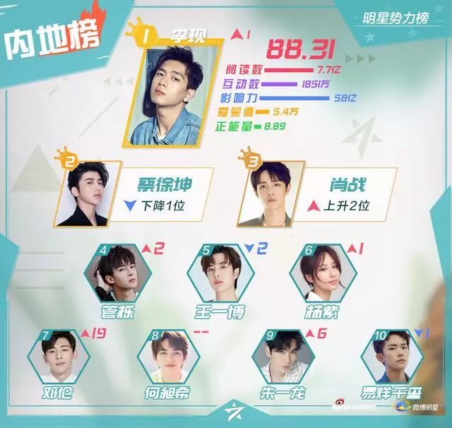 Lý Hiện, Vương Nhất Bác, Tiêu Chiến.. đều là những đỉnh cấp lưu lượng mới, vượt qua những lưu lượng cũ như Dịch Dương Thiên Tỉ, Chu Nhất Long… để họ đứng vị trí thứ 9, 10 trong bảng xếp hạng.