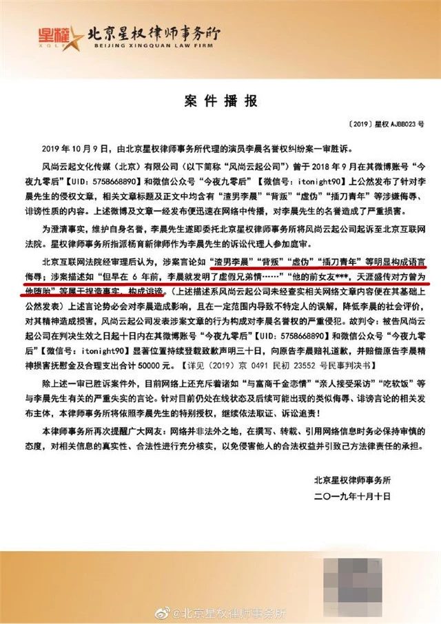 Hôm nay (10.10), tòa án ra quyết định, tuyên bố Lý Thần giành chiến thắng trong một vụ kiện liên quan đến danh dự, nhân phẩm. Bị cáo đã xúc phạm đến Lý Thần khi đăng bài phỉ báng, tố nam diễn viên là người đâm sau lưng bạn bè, là tra nam (người đàn ông tệ bạc, vô tình vô nghĩa). Kết quả, người này phải bồi thường cho Lý Thần phí tổn hại tinh thần số tiền 50 ngàn NDT cùng với đó là bài đăng xin lỗi duy trì trong 30 ngày.