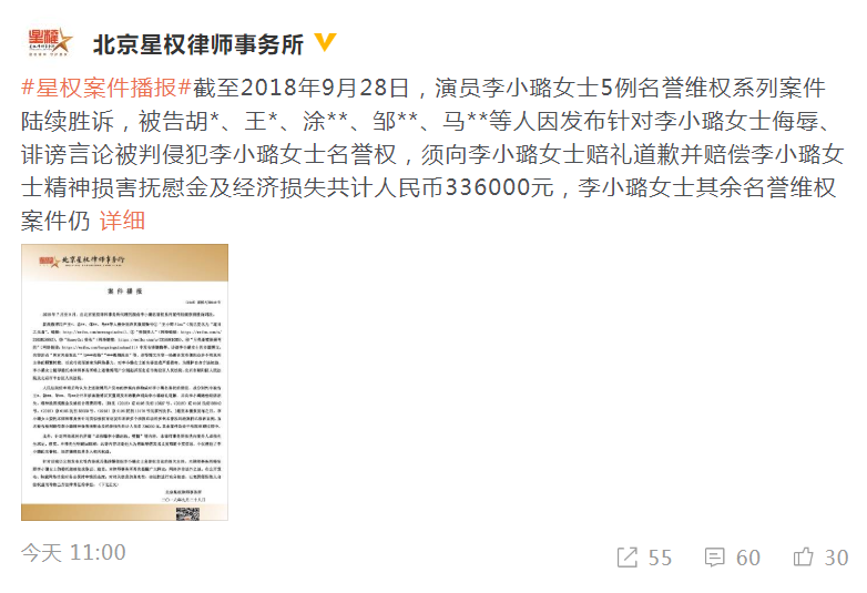 Ngày 29 tháng 8, phòng làm việc của Lý Tiểu Lộ đã đăng lên trên weibo cá nhân của mình thư thẩm phán của tòa án, thu hút sự quan tâm của khán giả, không biết chuyện gì đang xảy ra? Thì ra đây chính là thư phán quyết của tòa án của Lý Tiểu Lộ và bên phía cô là người giành toàn thắng.