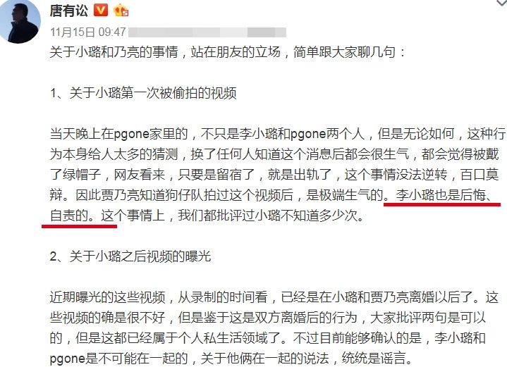 Sau khi tuyên bố chính thức ly hôn, Lý Tiểu Lộ và Giả Nãi Lượng luôn ẩn mình không xuất hiện. Sáng sớm ngày 15.11, Lý Tiểu Lộ đăng một bài viết dài lên Weibo bày tỏ bản thân đối mặt với vấn nạn bạo lực ngôn ngữ mạng trong thời gian vừa qua. Nhìn qua số bình luận, like và chia sẻ bài viết của Lý Tiểu Lộ có thể thấy ảnh hưởng lớn đến cỡ nào.