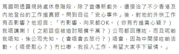 Ngoài câu trả lời không hề tìm đến Huỳnh Tâm Dĩnh, Mã Quốc Minh cũng gạt bỏ những câu hỏi như: Khi nào cả hai có thể tái hợp, Huỳnh Tâm Dĩnh khi nào sẽ xin lỗi,… Hiện tại, nam diễn viên đã bắt đầu tham gia những dự án phim mới, hy vọng truyền thông Hong Kong có thể để tâm đến những tác phẩm này của anh mà không quá chú trọng về cuộc sống cá nhân hay tình cảm của nam nghệ sỹ.