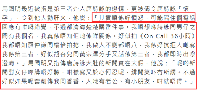 Nói về chuyện bị nói là kẻ thứ ba xen vào cuộc tình của Đường Thi Vịnh, hơn nữa còn bị nói làm Đường Thi Vịnh “có thai” làm anh cảm thấy tức giận: “Thực ra không có quá tức giận, có thể là vì nói qua điện thoại nên cảm giác hơi sai lệch, nhưng ở đây tôi sẽ nói rõ ràng chuyện này. Tôi không muốn tên mình đứng giữa chuyện tình của Đường Thi Vịnh và bạn trai”. Ngoài ra Mã Quốc Minh nói đưa chuyện người con gái có thai thực sự không tốt. Tin đồn lấy nói vui một tí thì được, nhưng nếu lấy chuyện đóng phim của tôi với Hương Hương ra làm tin đồn tình cảm thì thực quá không được vì cô ấy đã có chồng và có con.