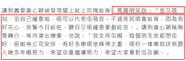 Nam diễn viên còn chia sẻ tin tức này không tốt với phụ nữ và cảm thấy đau lòng cho Đường Thi Vịnh. Đồng thời, anh cũng rất mở lòng khi nói về người yêu cũ Huỳnh Tâm Dĩnh. Mã Quốc Minh khi bị phóng viên hỏi đến việc Huỳnh Tâm Dĩnh đang chờ đợi cơ hội để quay lại đóng phim, anh cũng thẳng thắn chia sẻ: “Tôi ủng hộ cô ấy“.