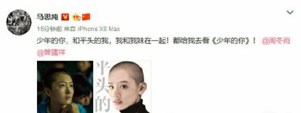 Nhìn thấy hình ảnh người chị em tốt được lên sóng, Mã Tư Thuần đương nhiên đứng ngồi không yên và không thể xem như không có chuyện gì xảy ra. Vì vậy mới đây mã Tư Thuần đã đăng tải hình mới trên Weibo vì Châu Đông Vũ tuyên truyền với nội dung: “Em của niên thiếu, và tôi với tạo hình tóc húi cua, tôi và em gái tôi ở bên cạnh nhau”.