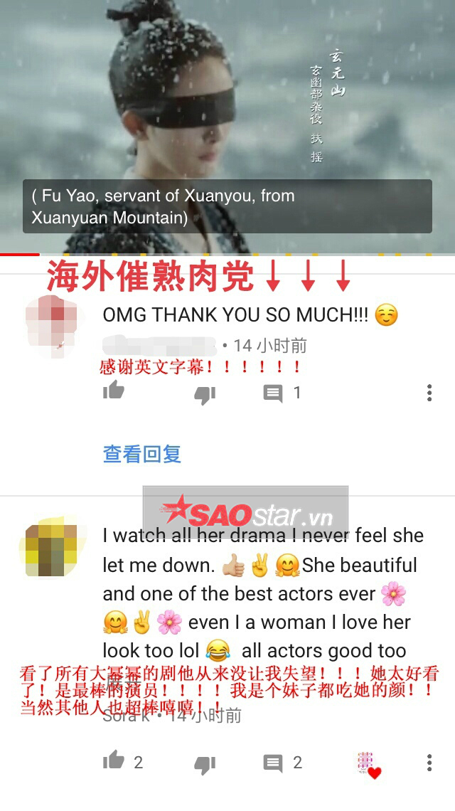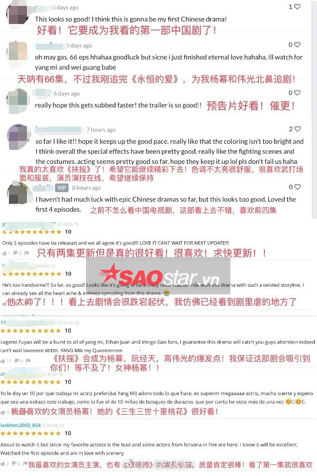 Hàng loạt bình luận trên các diễn đàn phim quốc tế, fan nước ngoài chờ đợi từng tập phim, thậm chí van nài các trang phim mong chóng “nhả” sub tiếng Anh để thỏa lòng mong đợi. Trên sân nhà Trung Quốc, trang đánh giá phim nổi tiếng Douban chỉ chấm Phù Dao đạt 4,6/10 điểm, thế nhưng ở thị trường quốc tế thì lại đối nghịch hoàn toàn. Điểm đánh giá 10/10 phủ đầy từ trên xuống trên các thang điểm, bình luận. Vô số lời khen có cánh về nội dung, diễn xuất của Dương Mịch và Nguyễn Kinh Thiên. Hãy cùng SAOstar điểm qua những bình luận của fan nước ngoài về bom tấn cổ trang Phù Dao nhé!